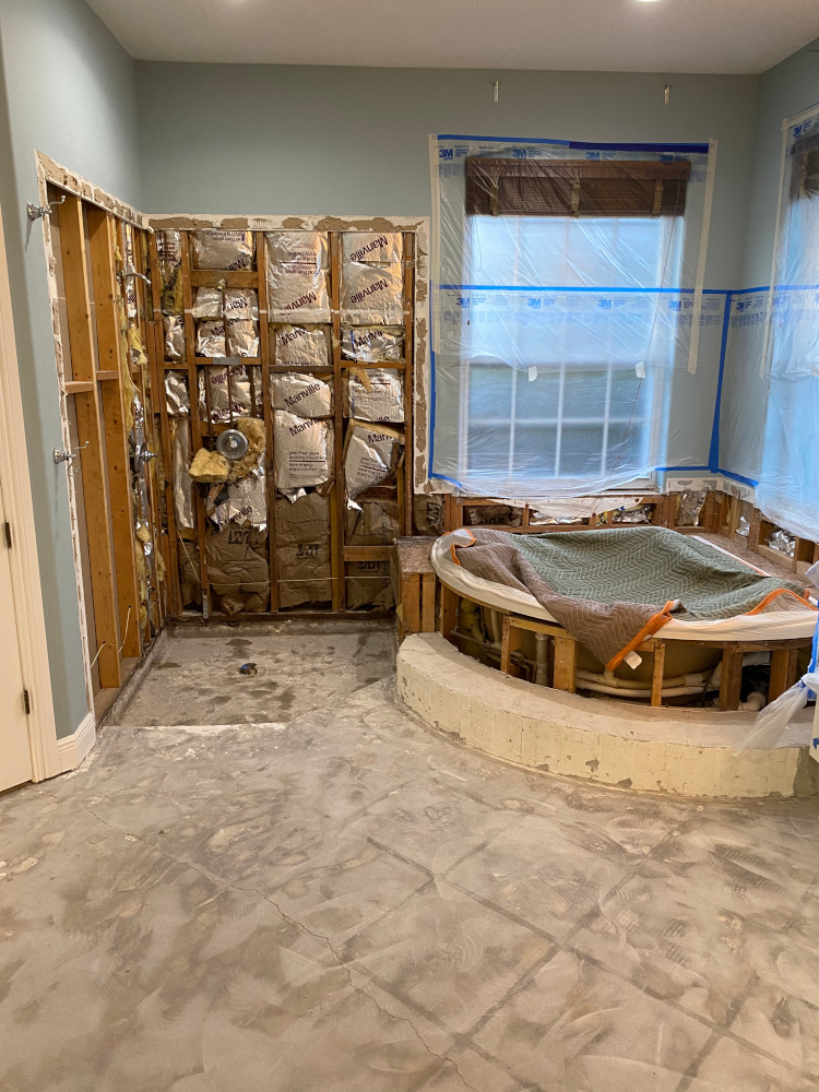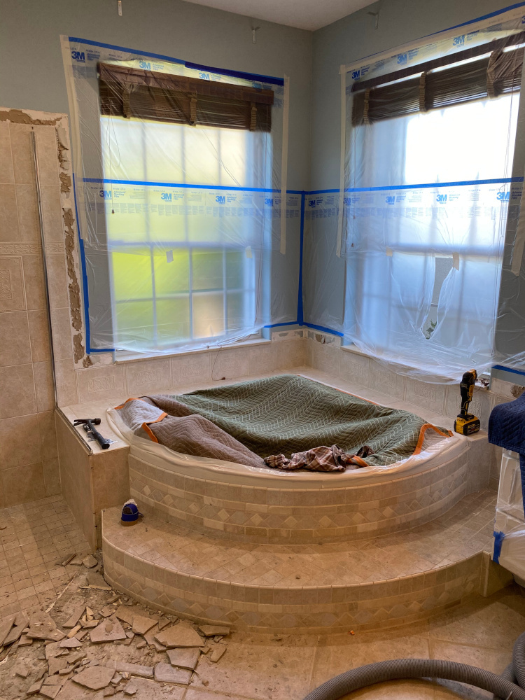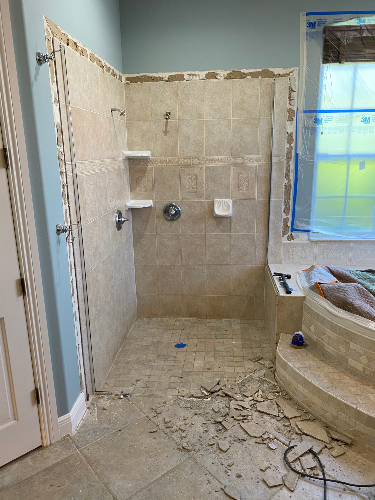 Our team can handle master bathrooms with both a shower and tub! We removed the tile floor as well as the tile in the shower and around the tub in this beautiful home in Melbourne, Florida.